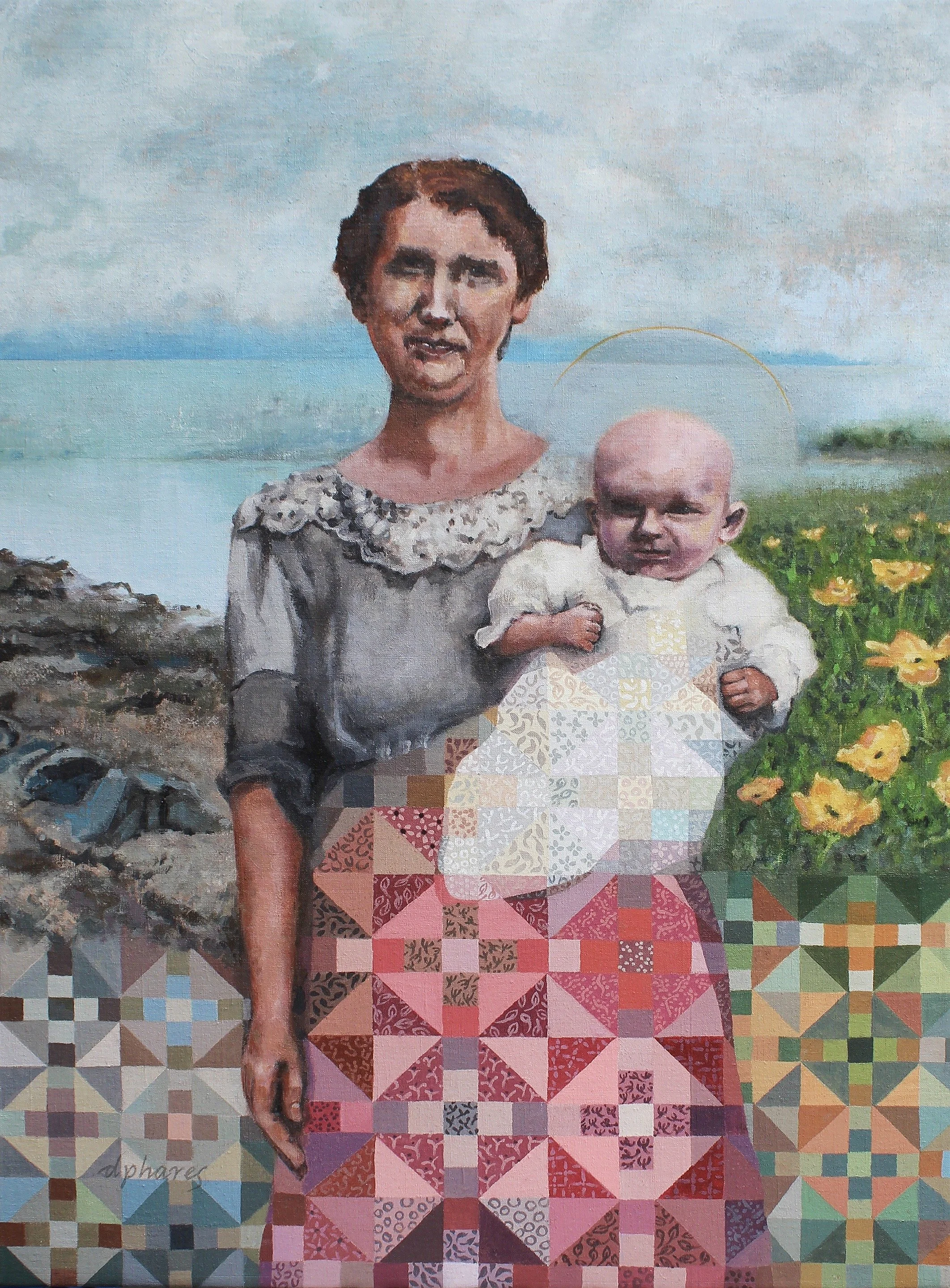 The study of authentic quilts led me to produce a series of works that embody themes of comfort and protection; however, a negative connotation of inequality and emotional hurt is occasionally buried beneath the patterned surface of a quilt. In most households, the woman creates the deep connections of soothing love and the quilt pattern is representative of that bond. The intricate motifs represent living, thriving bits of energy and are based on the tenderness revealed in organic designs from nature. In some works, thread has been used to sew and bind together the myriad images into a single painting. The antique quilt pieces depicted are preserved and restated in acrylic paint and combined with portraits of women.